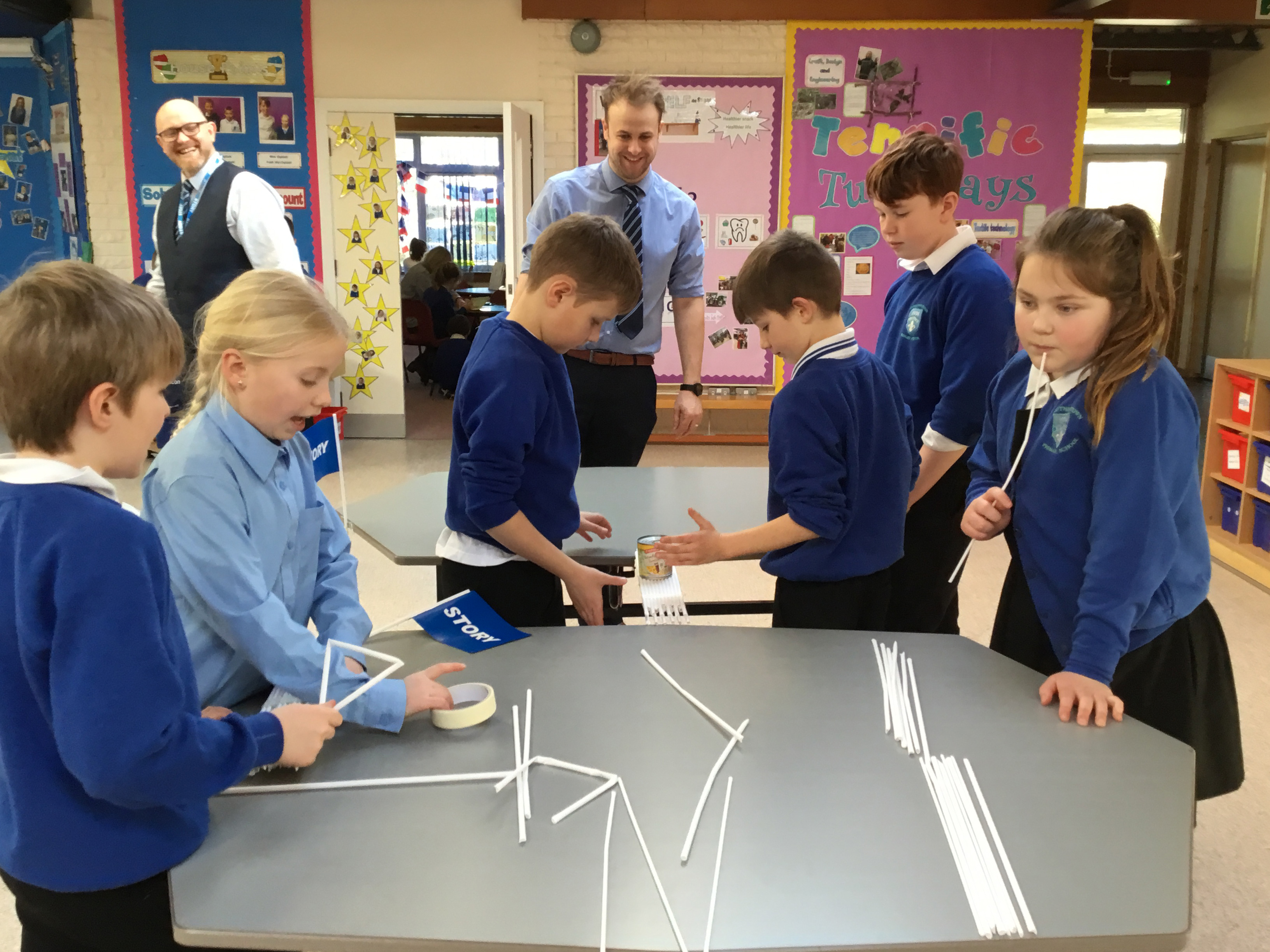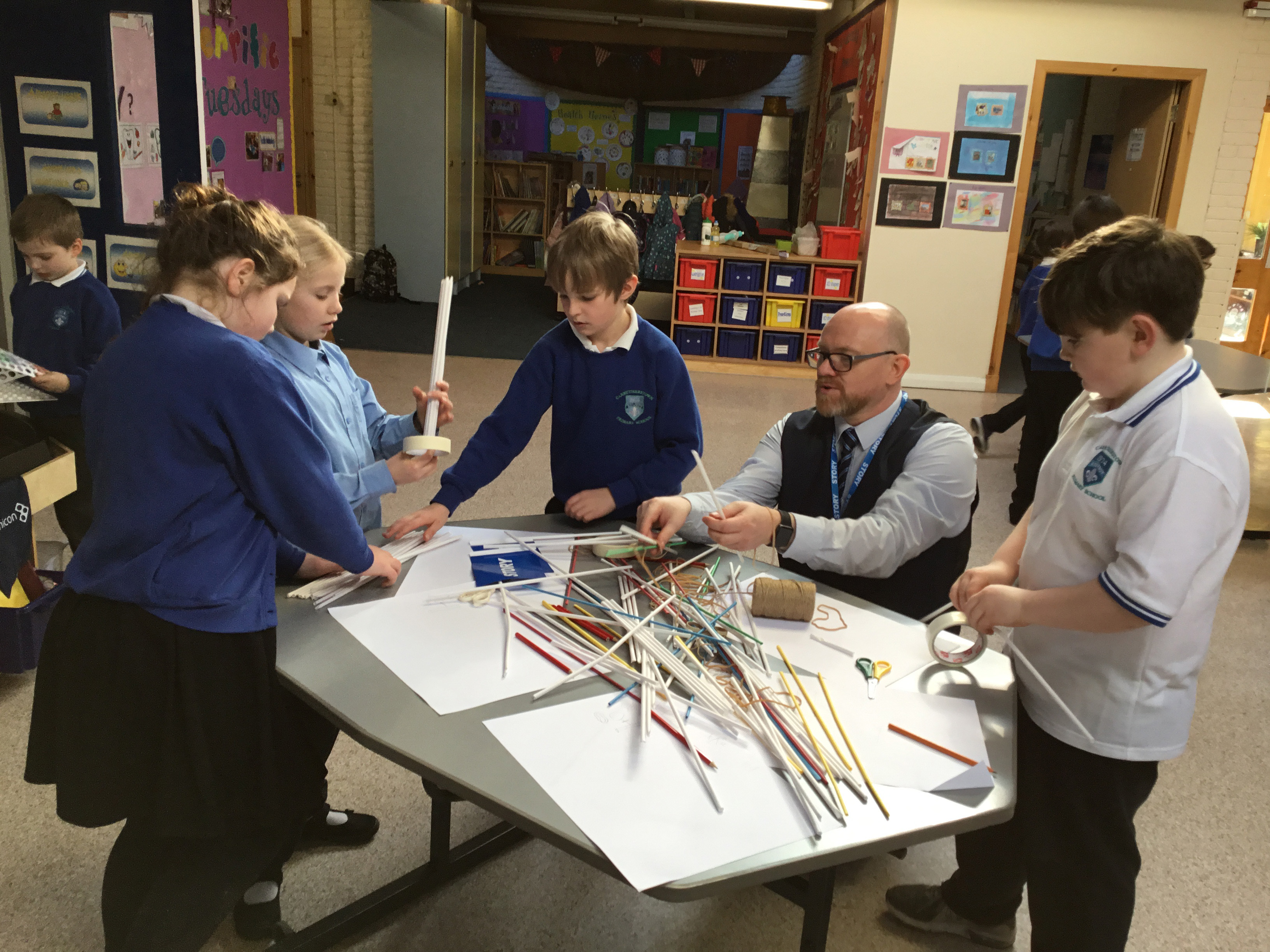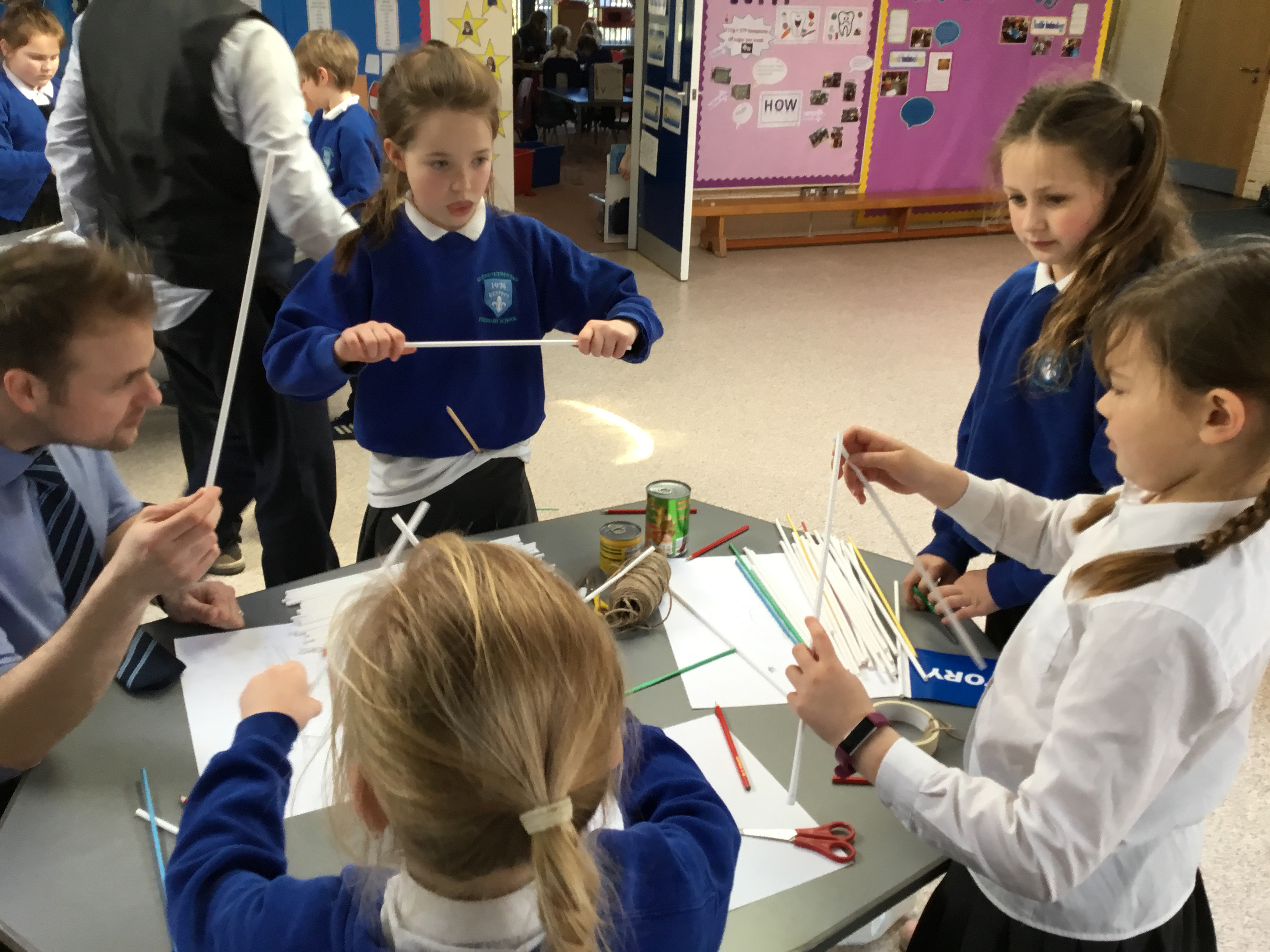Armed only with straws, tape, string and elastic bands, the students formed teams and set to work drawing draft designs before building their final structure.
